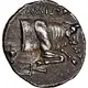 Descripción del reverso Forepart of bull right; crater to left, trident head left below, grain ear upward to right.