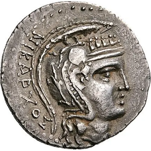 Descripción del anverso Head of Athena Parthenos to right, wearing an Attic helmet adorned with Pegasus, tendril, and four horse protomes