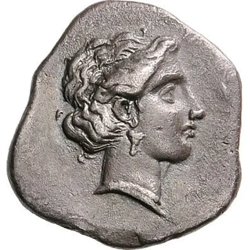 | Obverse description | Head of the nymph Arne to right, wearing pendant earring and necklace |