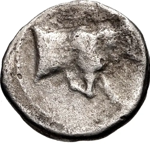 | توضیحات روی سکه | Forepart of man-headed bull facing right. |