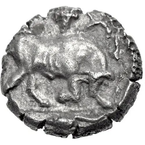 | توضیحات روی سکه | Bull butting right. Above, a grape bunch on vine that extends down into exergue |