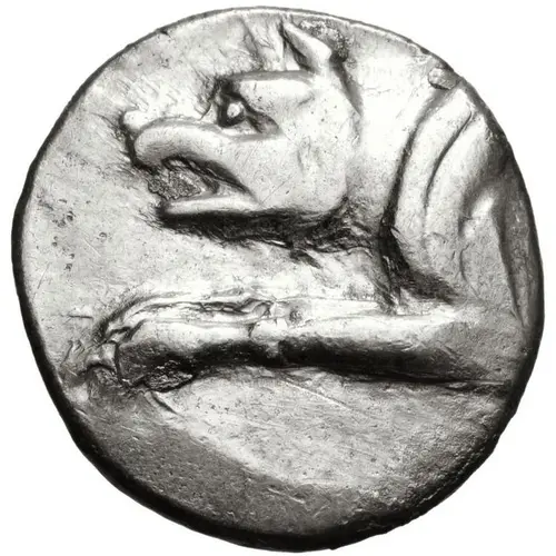 | Beschrijving voorzijde | Forepart of wolf at bay to left. |