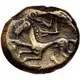 Reversbeschreibung Horse galloping left; above the horse, the charioteer; triskelion under the horse.