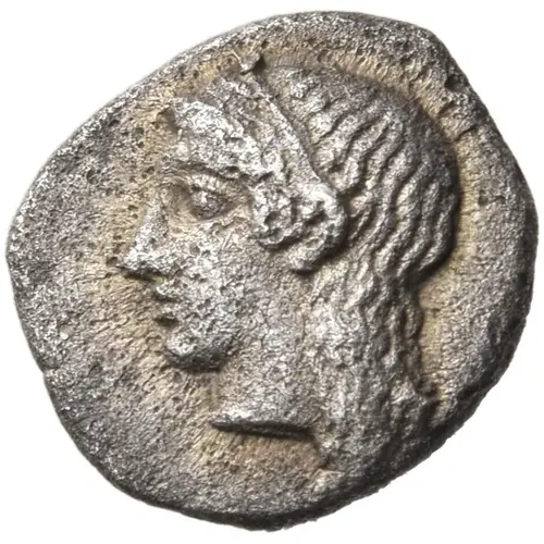 | Aversbeschreibung | Head of Athena to left, wearing a taenia and with her long hair falling down the back of her neck. |