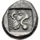 | Reversbeschreibung | Head of roaring lion right, neck truncation in row of dots; all within incuse square. |