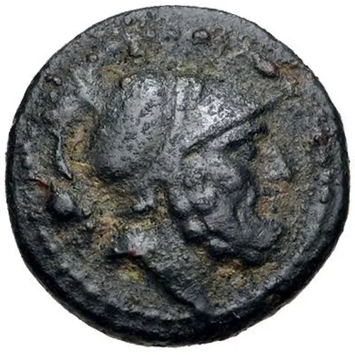 | Mô tả mặt trước | Bearded head of Ares to right, wearing crested Corinthian helmet; pellet (mark of value) behind. |