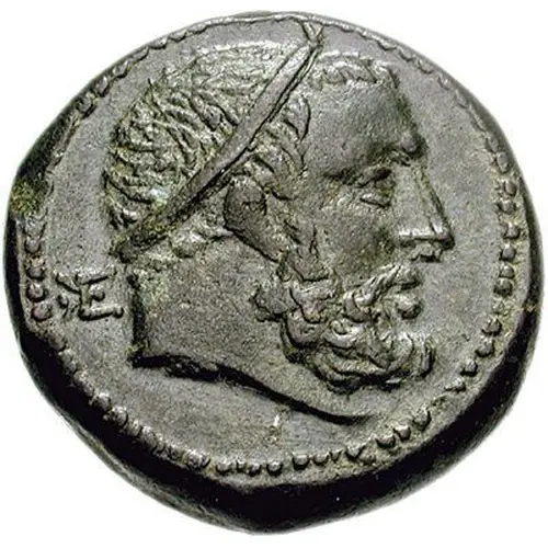 | توضیحات روی سکه | Diademed and bearded head of Herakles right; monogram behind. |