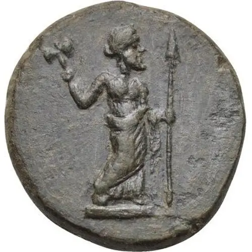 | توضیحات روی سکه | Zeus Lepsynos standing right, holding labrys in right hand and spear in left. |