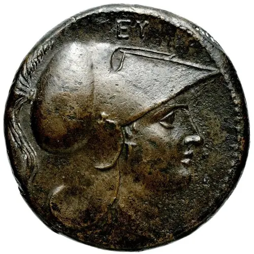 | توضیحات روی سکه | Head of Athena right, wearing crested Corinthian helmet; ΕΥ above. |