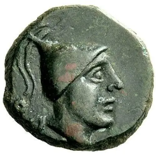 | Ön yüz açıklaması | Young male head right, wearing crested conical helmet; behind or below ΑΛ. |