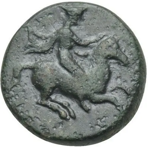 | Obverse description | Horseman, wearing chlamys and petasos, on horse galloping right. |
