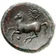 | Reverse description | Horse galloping left, radiate head of Helios above. |