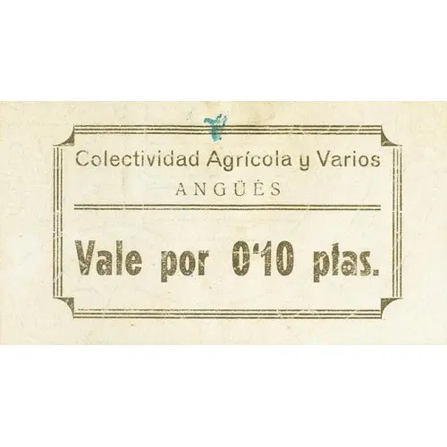 Colectividad Agrícola y Varios ANGÜÉS Vale por 0`10 ptas. (Translation: Agricultural Collectivity and Others Angues Valid for 0.10 Pesetas) |