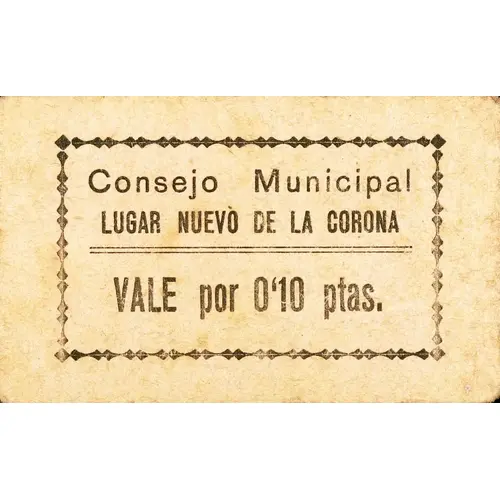| Obverse lettering | Consejo Municipal LUGAR NUEVO DE LA CORONA VALE por 0`10 ptas. (Translation: Municipal Council Lugar Nuevo de la Corona Voucher for 0.10 Pesetas) |