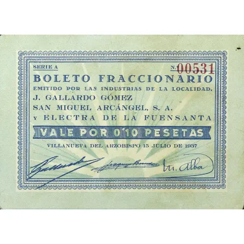 | Obverse lettering | BOLETO FRACCIONARIO EMITIDO POR LAS INDUSTRIAS DE LA LOCALIDAD, J. GALLARDO GÓMEZ SAN MIGUEL ARCÁGEL, S. A. Y ELECTRA DE LA FUENSANTA VALE POR 0`10 PESETAS VILLANUEVA DEL ARZOBISPO 15 JULIO DE 1937 (Translation: Fractional ticket Issued by local industries, J. Gallardo Gomez San Miguel Arcangel, S. A. and Electra de la Fuensanta It`s worth 0.10 Pesetas Villanueva del Arzobispo July 15, 1937) |