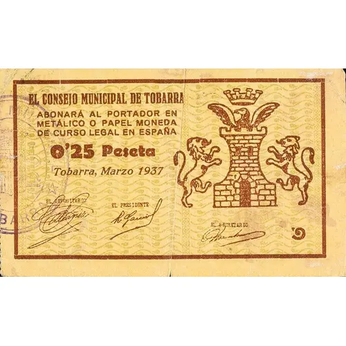 EL CONSEJO MUNICIPAL DE TOBARRA ABONARÁ AL PORTADOR EN METÁLICO O PAPEL MONEDA DE CURSO LEGAL EN ESPAÑA 0`25 Peseta Tobarra, Marzo 1937 (Translation: The Municipal Council of Tobarra Will pay the bearer in cash or paper money of legar tender in Spain 0.25 Pesetas Tobarra, March 1937) |