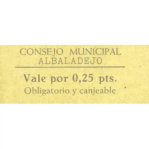 CONSEJO MUNICIPAL ALBALADEJO Vale por 0,25 pts. Obligatorio y canjeable (Translation: Municipal Council Albaladejo Voucher for 0.25 Pesetas Mandatory and redeemable) |