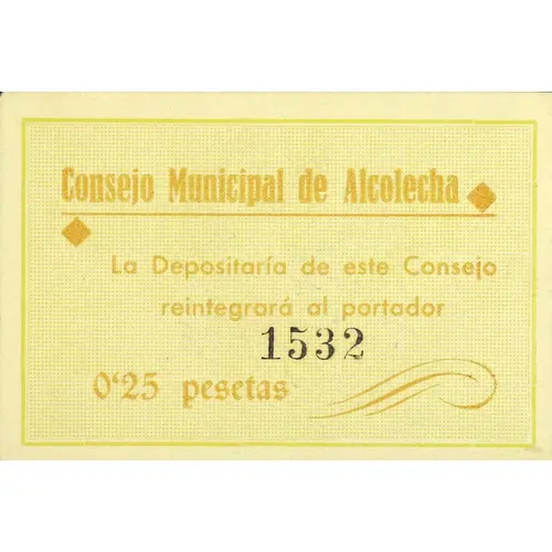 Consejo Municipal de Alcolecha La Depositaría de este Consejo reintegrará al portador 0`25 pesetas (Translation: Municipal Council of Alcolecha The Depository of this Council will reimburse the bearer 0.25 Pesetas) |