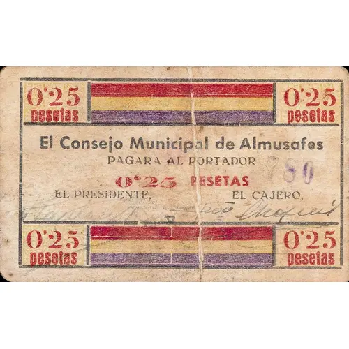 | Obverse lettering | 0`25 pesetas EL CONSEJO MUNICIPAL de ALMUSAFES PAGARA AL PORTADOR 0`25 PESETAS (Translation: 0.25 Pesetas The Municipal Council of Almusafes Will pay the bearer 0.25 Pesetas) |