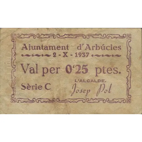 Ajuntament d`Arbúcies 2-X-1937 Val per 0`25 ptes. Sèrie C L`Alcalde, (Translation: City Council of Arbúcies 2-October.1937 Voucher for 0.25 Pesetas Series C The Mayor) |