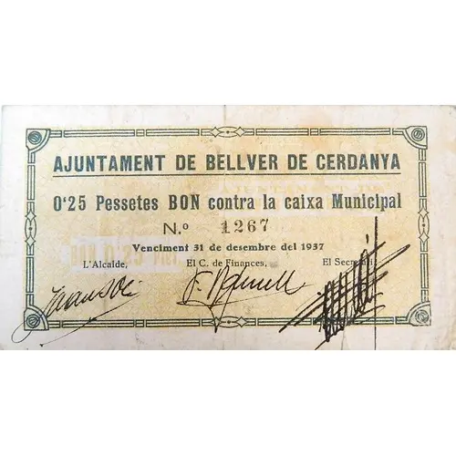 AJUNTAMENT DE BELLVER DE CERDANYA 0`25 Pessetes BON contra la caixa Municipal Venciment 31 de desembre del 1937 (Translation: City Council of Bellver de Cerdanya 0.25 Pesetas Bond against the `Ciaxa Municipal` Expiration December 31, 1937) |