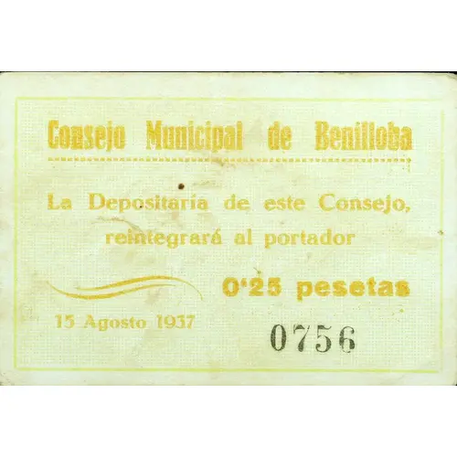 | Obverse lettering | Consejo Municipal de Benilloba La Depositaría de este Consejo, reintegrará al portador 0`25 pesetas 15 Agosto 1937 (Translation: Municipal Council of Benilloba The Depositary of this Council will reimburse the bearer 0.25 Pesetas August 15, 1937) |