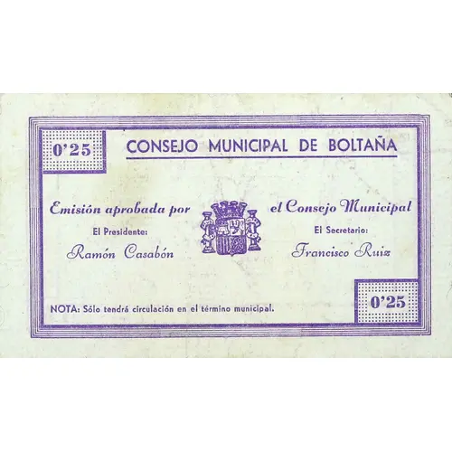 0`25 CONSEJO MUNICIPAL DE BOLTAÑA Emisión aprobada por el Consejo Municipal NOTA: Sólo tendrá circulación en el término municipal. (Translation: Municipal Council of Boltaña Issue approved by the Municipal Council NOTE: It will only have circulation in the municipal term.) |