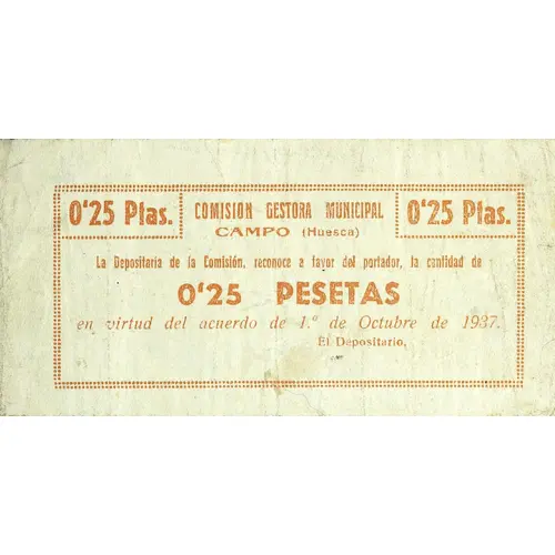 0`25 Ptas. COMISION GESTORA MUNICIPAL CAMPO (Huesca) La Depositaría de la Comisión, reconoce a favor del portador, la cantidad de 0`25 PESETAS en virtud del acuerdo de 1º de Octubre de 1937. (Translation: 0.25 Pesetas Municipal Management Committee of Campo (Huesca) The Depositary of the Commission, recognizes in favor of the bearer, the amount of 0.25 Pesetas under the agreement of October 1, 1937.) |
