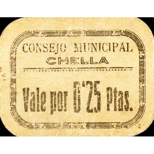 CONSEJO MUNICIPAL CHELLA Vale por 0`25 Ptas. (Translation: Municipal Council Chella Voucher for 0.25 Pesetas) |