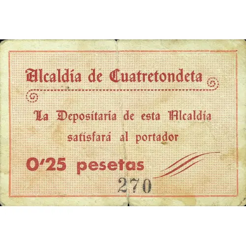 Alcaldía de Cuatretondeta La Depositaría de esta Alcaldía satisfará al portador 0`25 pesetas (Translation: Mayoralty of Cuatretondeta The depository of this Mayoralty will satisfy the bearer 0.25 Pesetas) |