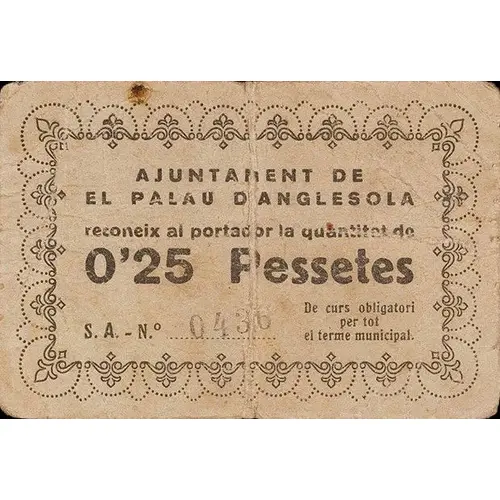 AJUNTAMENT DE EL PALAU D`ANGLESOLA reconeix al portador la quantitat de 0`25 Pessetes De curs obligatori per tot el terme municipal. (Translation: City Council of El Palau d`Anglesola recognizes the bearerthe amount of 0.25 Pesetas Mandatory course for the whole municipality.) |
