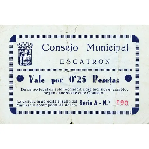 | Legenda del dritto | Consejo Municipal ESCATRON Vale por 0`25 Pesetas De curso legal en esta localidad, para facilitar el cambio, según acuerdo de este Consejo La validez la acredita el sello del Municipio estampado al dorso (Translation: Municipal Council Escatron Voucher for 0.25 Pesetas Legal tender in this locality, to facilitate the exchange, according to the agreement of this Council Validity is confirmed by the stamp of the Municipality stamped on the back) |