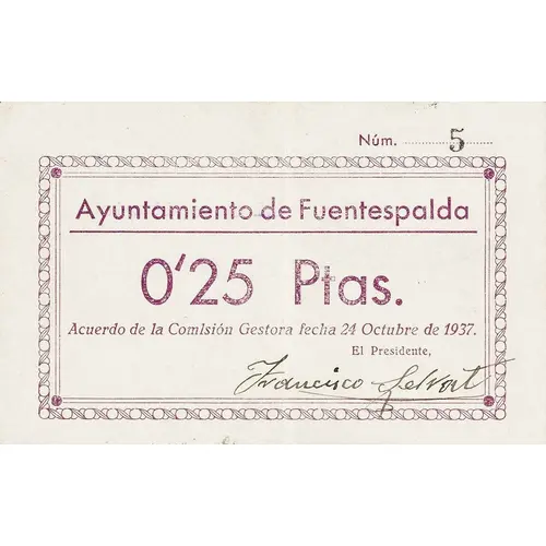 Ayuntamiento de Fuentespalda 0`25 Ptas. Acuerdo de la Comisión Gestora fecha 24 Octubre de 1937. (Translation: City Council of Fuentespalda 0.25 Pesetas Agreement of the Management Commission dated October 24, 1937.) |