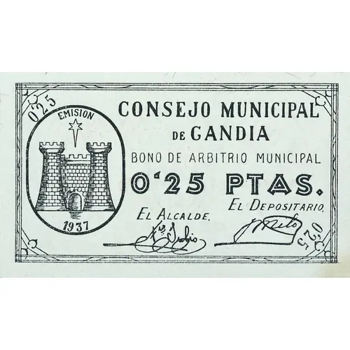 | Obverse lettering | EMISION 1937 CONSEJO MUNICIPAL DE GANDIA BONO DE ARBITRIO MUNICIPAL 0`25 PTAS. (Translation: Issue 1937 Municipal Council of Gandia Municipal arbitration bond 0.25 Pesetas) |