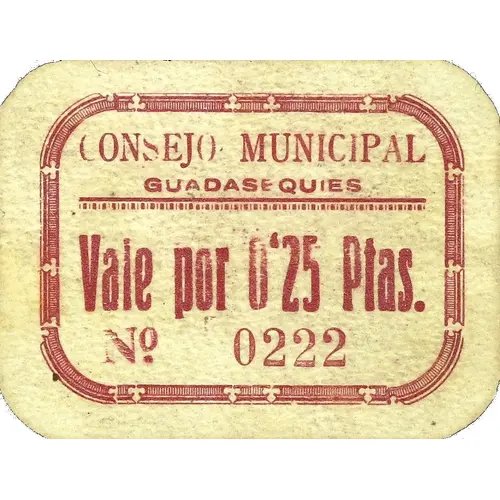 | Obverse lettering | CONSEJO MUNICIPAL GUADASEQUIES Vale por 0`25 Ptas. (Translation: Municipal Council Guadasequies Voucher for 0.25 Pesetas) |