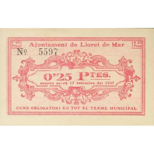 Ajuntament de Lloret de Mar 0`25 PTES. segons acord 17 setembre del 1937 CURS OBLIGATORI EN TOT EL TERME MUNICIPAL (Translation: City Council of Lloret de Mar 0.25 Pesetas according to agreement September 17, 1937 Mandatory course throughout the Municipal term) |