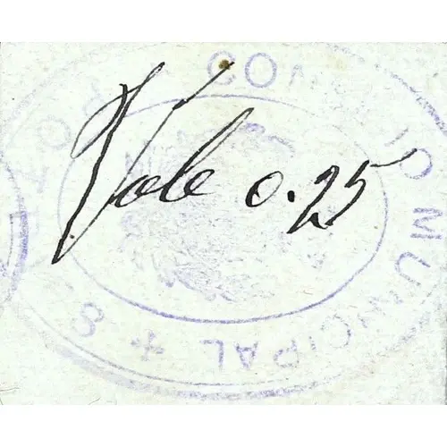 | Obverse description | Black handwritten face value with blue oval municipal stamp. |