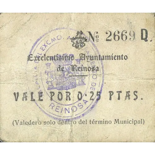 | Obverse lettering | Excelentísimo Ayuntamiento de Reinosa VALE POR 0`25 PTAS. (Valedero solo dentro del término Municipal) (Translation: Worshipful City Council of Reinosa Voucher for 0.25 Pesetas Valid only within the Municipal term) |