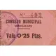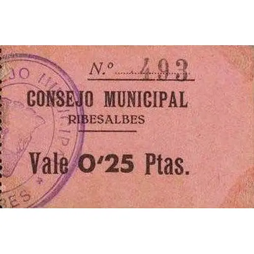 | Vorderseitenlegende | CONSEJO MUNICIPAL RIBESALBES Vale 0`25 Ptas. (Translation: Municipal Council Ribesalbes It`s worth 0.25 Pesetas) |