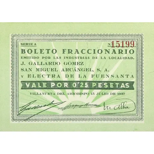 BOLETO FRACCIONARIO EMITIDO POR LAS INDUSTRIAS DE LA LOCALIDAD, J. GALLARDO GÓMEZ SAN MIGUEL ARCÁGEL, S. A. Y ELECTRA DE LA FUENSANTA VALE POR 0`25 PESETAS VILLANUEVA DEL ARZOBISPO 15 JULIO DE 1937 (Translation: Fractional ticket Issued by local industries, J. Gallardo Gomez San Miguel Arcangel, S. A. and Electra de la Fuensanta It`s worth 0.25 Pesetas Villanueva del Arzobispo July 15, 1937) |