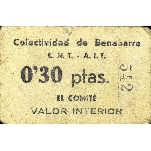 Colectividad de Benabarre C.N.T.- A.I.T. 0`30 ptas. EL COMITÉ VALOR INTERIOR (Translation: Collectivity of Benabarre C.N.T.- A.I.T. 0.30 Pesetas The Committee Local Value) |