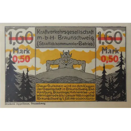 Kraftverkehrsgesellschaft m.b.H. Braunschweig (Staatlich kommunaler Betrieb) Dieser Gutschein wird an den Kassen der Gesellschaft in Braunschweig, Bad Harzburg, Braunlage, Hahnenklee und Wernigerode bis 1. Januar 1922 eingelöst. Braunschweig 1 Juli 1921 (Translation: Motor transport company of Brunswick (State-owned company) This voucher will be redeemed at the company`s cash desks in Braunschweig, Bad Harzburg, Braunlage, Hahnenklee and Wernigerode until January 1, 1922. Brunswick July 1, 1921) |