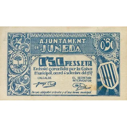 AJUNTAMENT DE JUNEDA 0`50 PESSETA Emissió garantida per la Caixa Municipal, acord 4 setembre del 1937 De curs obligatori a la vila y el seu terme municipal (Translation: City Council of Juneda 0.50 Peseta Issue guaranteed by the `Caixa Municipal`, agreement September 4, 1937 Mandatory course in the town and its municipality) |