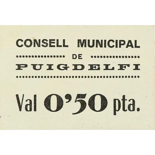 CONSELL MUNICIPAL DE PUIGDELFI Val 0`50 pta. (Translation: Municipal Council of Puigdelfí It`s worth 0.50 Peseta) |