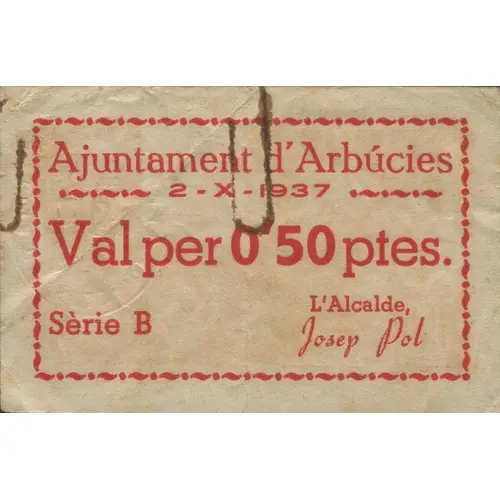 Ajuntament d`Arbúcies 2-X-1937 Val per 0`50 ptes. Sèrie B L`Alcalde, (Translation: City Council of Arbúcies 2-October.1937 Voucher for 0.50 Pesetas Series B The Mayor) |