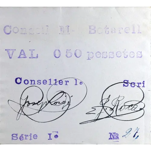 Consell M. Botarell VAL 0`50 pessetes Conseller 1º Scri (Translation: Municipal Council Botarell It`s worth 0.50 Pesetas 1st Councilor Secretary) |