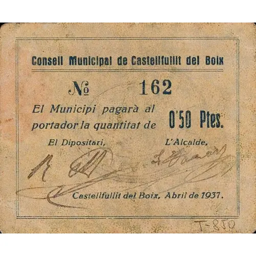 Consell Municipal de Castellfullit del Boix El Municipi pagarà al portador la quantitat de 0`50 Ptes. Castellfullit del Boix, Abril de 1937. (Translation: Municipal Council of Castellfullit del Boix The Municipality will pay the bearer the amount of 0.50 Pesetas Castellfullit del Boix, April 1937.) |