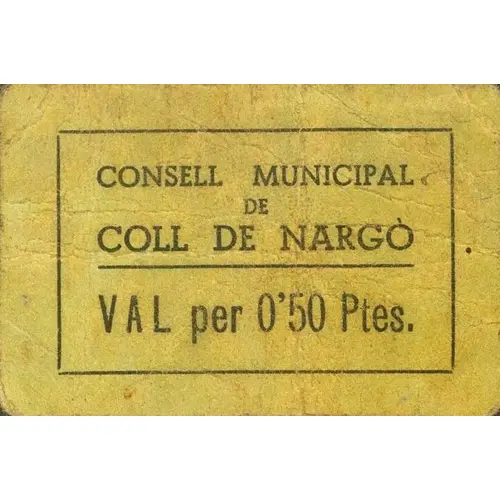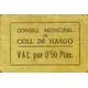 CONSELL MUNICIPAL DE COLL DE NARGÒ VAL per 0`50 Ptes. (Translation: Municipal Council of Coll de Nargò Voucher for 0.50 Pesetas) |