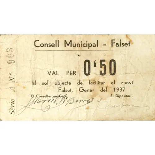 Consell Municipal - Falset VAL PER 0`50 al sol objecte de facilitar el canvi Falset, Gener del 1937 (Translation: Municipal Council - Falset Voucher for 0.50 with the sole purpose of facilitating change Falset, January 1937) |