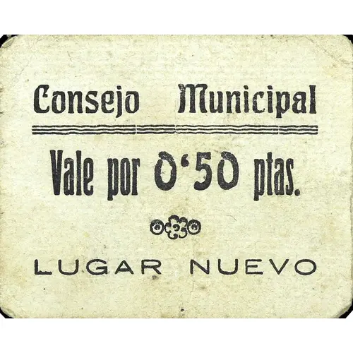 (Translation: Municipal Council Voucher for 0.50 Pesetas Lugar Nuevo)